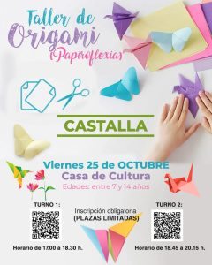 T’apassiona l’art del paper? No et perdes el nostre taller d’origami (papiroflèxia) el pròxim divendres, 25 d’octubre, ideal per a xiquets i xiquetes d’entre 7 i 14 anys. Aprén a crear figures increïbles amb les teues pròpies mans!