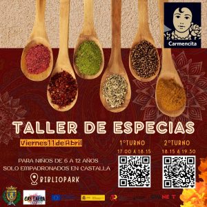 El taller ofrece una experiencia sensorial y educativa donde los más pequeños podrán descubrir las especias, sus colores, olores y sabores, de la mano de Carmencita. ¡Una actividad divertida, diferente y llena de aromas!