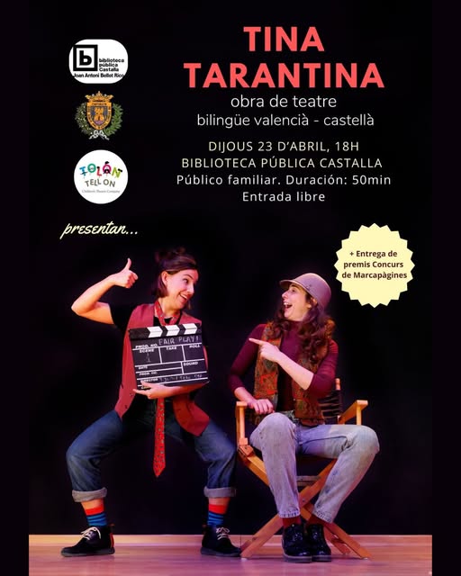 “TINA TARANTINA” arriba a Castalla! ✨🎭 📚 El pròxim dijous 𝟮𝟯 𝗱’𝗮𝗯𝗿𝗶𝗹 𝗮 𝗹𝗲𝘀 𝟭𝟴𝗵 tens una cita a la Biblioteca Pública Castalla de Castalla amb “Tina Tarantina”, de la companyia TOLÓN TELL ON . 🎭 Una obra 𝗯𝗶𝗹𝗶𝗻𝗴ü𝗲 𝗲𝗻 𝘃𝗮𝗹𝗲𝗻𝗰𝗶à 𝗶 𝗰𝗮𝘀𝘁𝗲𝗹𝗹à que no et deixarà indiferent! 🎟️ 𝗘𝗻𝘁𝗿𝗮𝗱𝗮 𝗹𝗹𝗶𝘂𝗿𝗲 🏆 A més, durant l’acte es lliuraran els premis del 𝗖𝗼𝗻𝗰𝘂𝗿𝘀 𝗱𝗲 𝗠𝗮𝗿𝗰𝗮𝗽à𝗴𝗶𝗻𝗲𝘀. 💫 No t’ho perdes! --------------------------------------